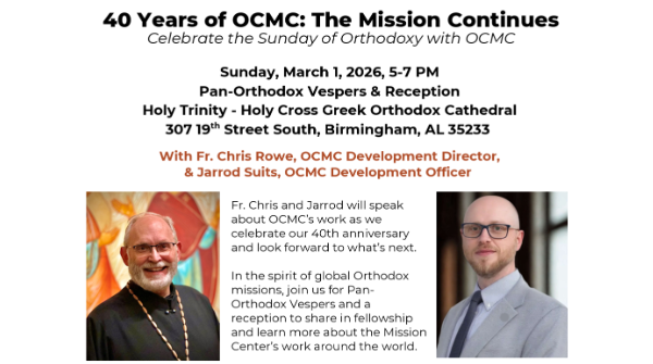 Fr. Chris Rowe, OCMC Development Director, and Jarrod Suits, OCMC Development Officer, will speak about OCMC's work as they celebrate their 40th anniversary and look forward to what's next. In the spirit of global Orthodox missions, we will have a Pan-Orthodox Vespers and a reception to share in fellowship and learn more about the Mission Center's work around the world.